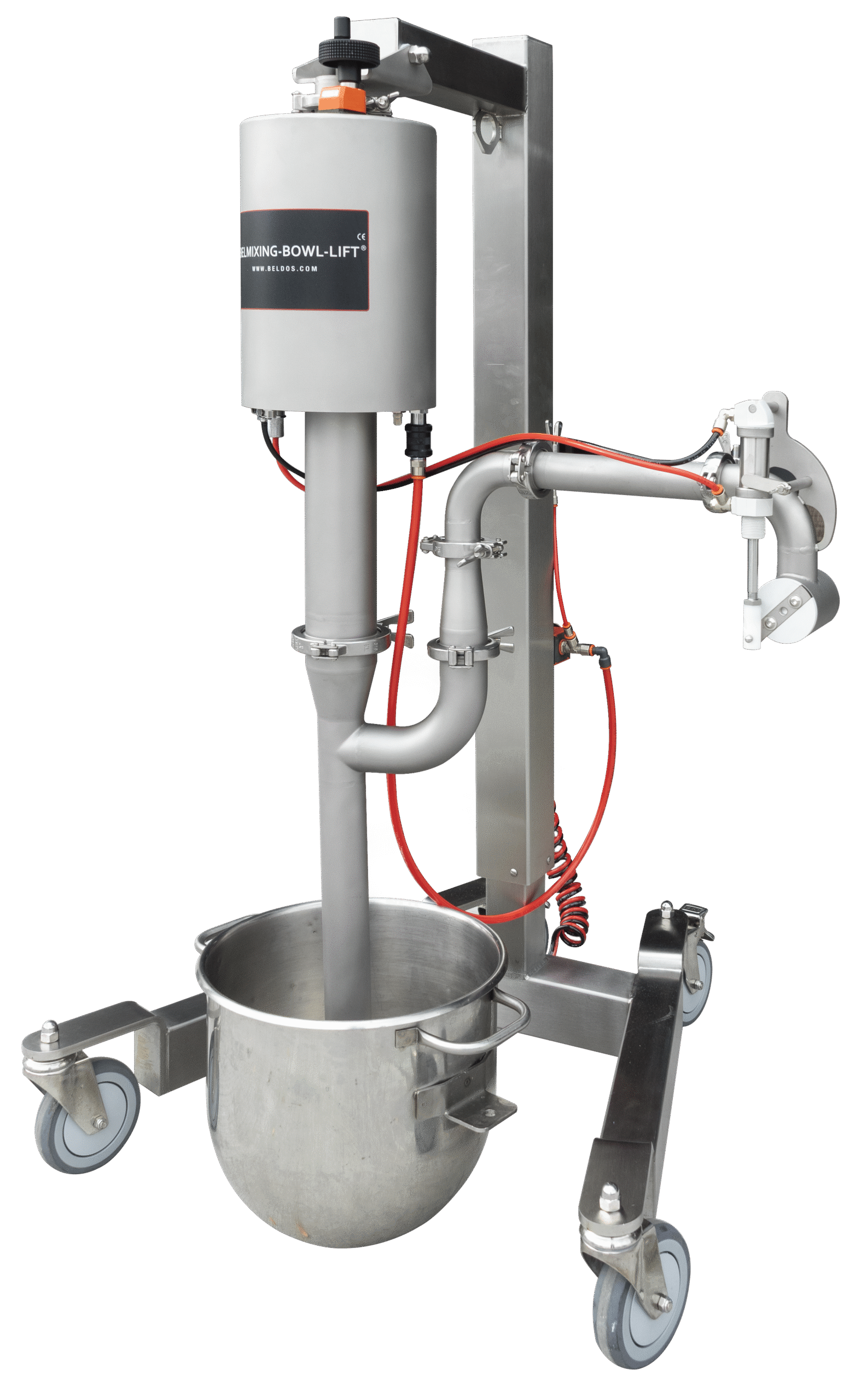 Pneumatyczny system dla łatwego i delikatnego przenoszenia ciasta, nadzienia, czy kremu z miski do leja depozytowego.
