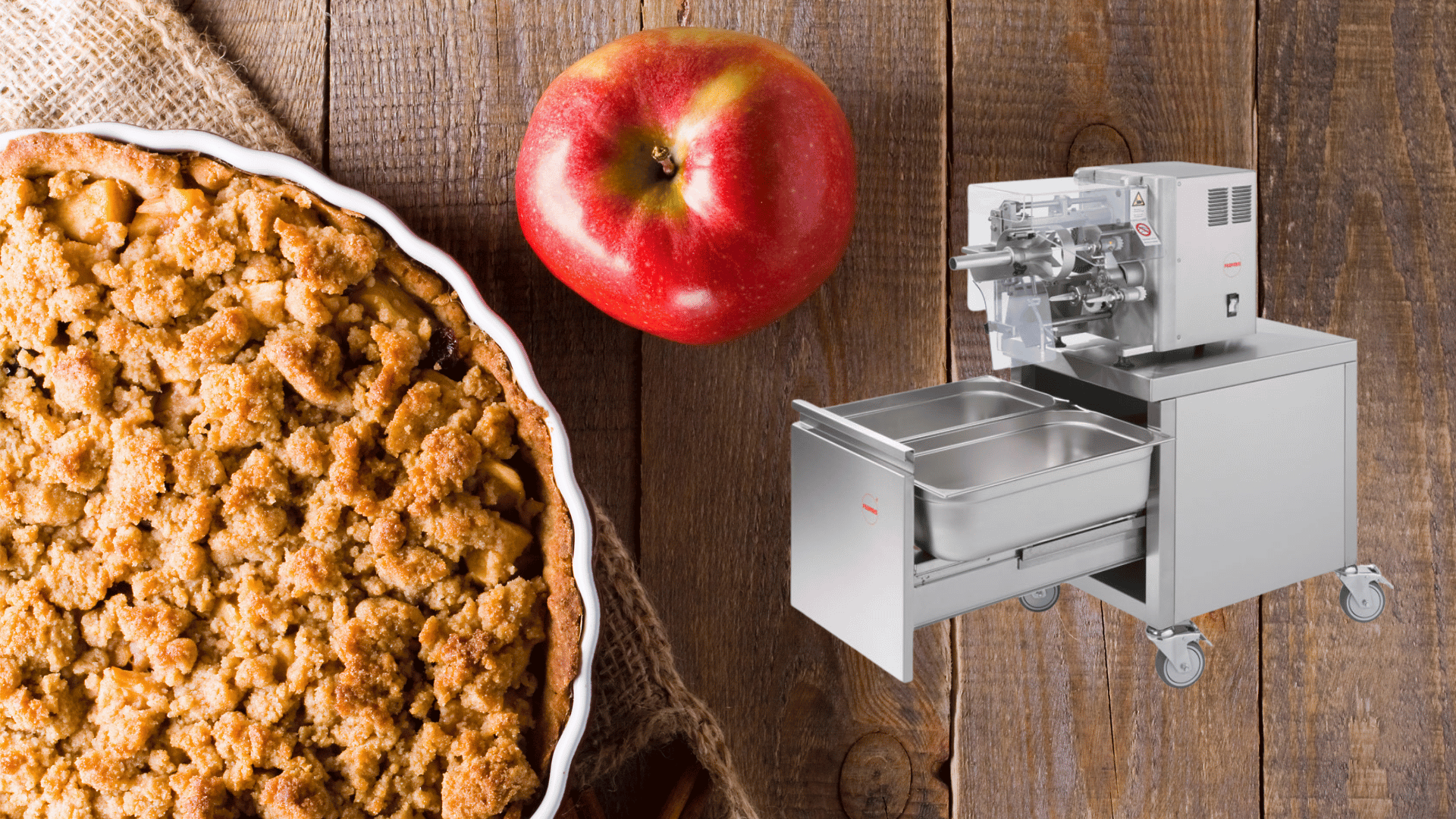 Specjalistyczne urządzenia przeznaczone do obierania i drylowania jabłek o średnicy/długości od 30 do 85/80 mm. Możliwe jest także dzielenie na ćwiartki oraz krojenie na plastry, które można łączyć, aby uzyskać drobne kawałki jabłek do sałatek lub ciast.